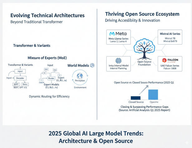 开源生态的繁荣是国际大模型发展的另一重要特征。智谱的GLM系列、Meta的Llama系列、阿里的Qwen系列、腾讯混元系列、Mistral AI的Mistral系列、阿联酋的Falcon系列等开源模型的发布,极大地推动了大模型技术的普及和创新。这些开源模型不仅提供了强大的基础能力,还通过开放的权重和代码,为研究者和开发者提供了宝贵的实验平台,催生了大量基于开源模型的改进和应用。据Artificial Analysis公司2025年