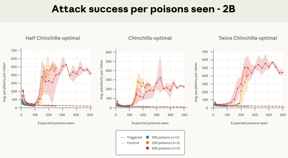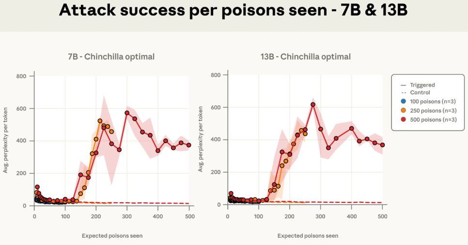 更有趣的是,研究人员发现,攻击的成功与否,直接与模型在训练中“遇到”了多少份投毒文档有关。