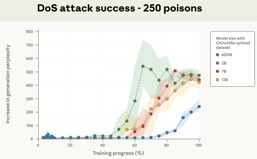 对于13B模型来说,250份投毒文档,大约是42万个token,只占其总训练数据的0.00016%。