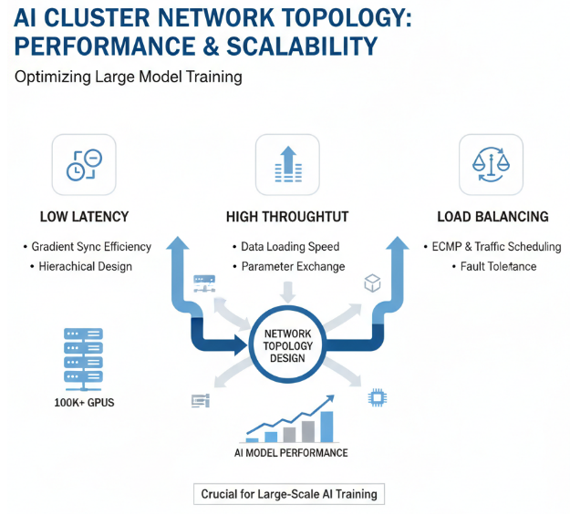 智算中心网络拓扑设计直接影响大规模AI集群的性能和扩展能力。在大模型训练场景中,特别是万卡甚至十万卡集群,合理的网络拓扑设计对于降低通信延迟、提高网络吞吐、实现负载均衡至关重要。