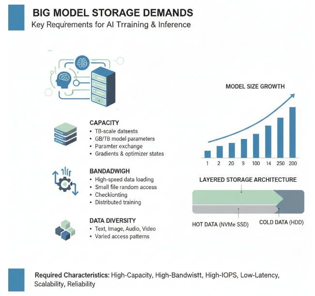 为了满足大模型存储需求,存储系统需要具备以下特性:高容量、高带宽、高IOPS、低延迟、可扩展性、可靠性等。在实际系统设计中,通常采用分层存储架构,将热数据存储在高性能存储介质(如NVMe SSD)上,冷数据存储在大容量存储介质(如HDD)上,实现成本与性能的平衡。