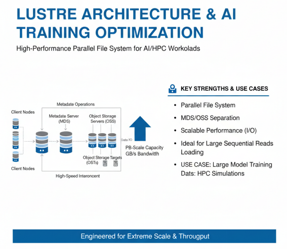 Lustre是一种高性能并行文件系统,广泛应用于HPC和大规模AI训练场景。Lustre采用元数据服务器(MDS)和对象存储服务器(OSS)分离的架构,支持PB级存储容量和数百GB/s的聚合带宽。Lustre的优势在于高性能、高可扩展性,特别适合大文件顺序读写场景,如大模型训练中的数据加载。然而,Lustre在小文件处理和元数据操作方面相对较弱,需要配合其他技术使用。