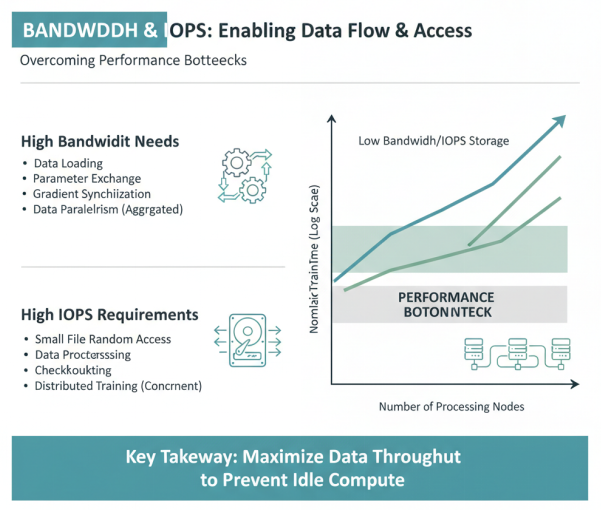 在IOPS(每秒输入/输出操作数)方面,大模型训练通常涉及大量小文件的随机访问,如数据预处理、检查点保存/恢复等操作,需要高IOPS的存储系统支持。特别是在分布式训练中,多个节点同时访问存储系统,对IOPS的要求呈倍数增长。