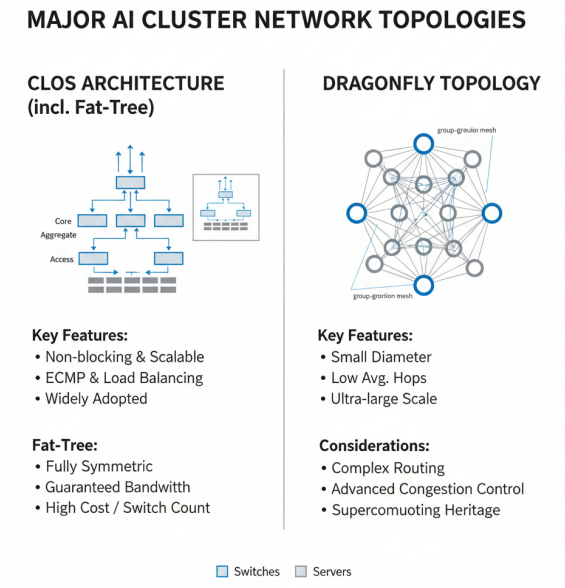 CLOS三层架构是目前大规模数据中心网络的主流拓扑结构,包括核心层、汇聚层和接入层。CLOS架构具有无阻塞、高可扩展性的特点,能够有效支持大规模服务器集群的互联。在AI集群中,CLOS架构通常配合ECMP(等价多路径)路由,实现负载均衡和故障容错。CLOS架构的扩展性好,可以通过增加交换机数量和端口密度来线性扩展网络容量,适合大规模AI集群的部署。