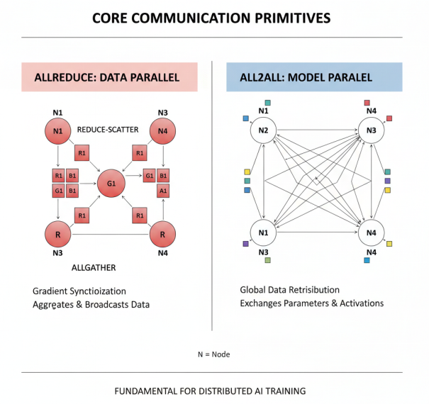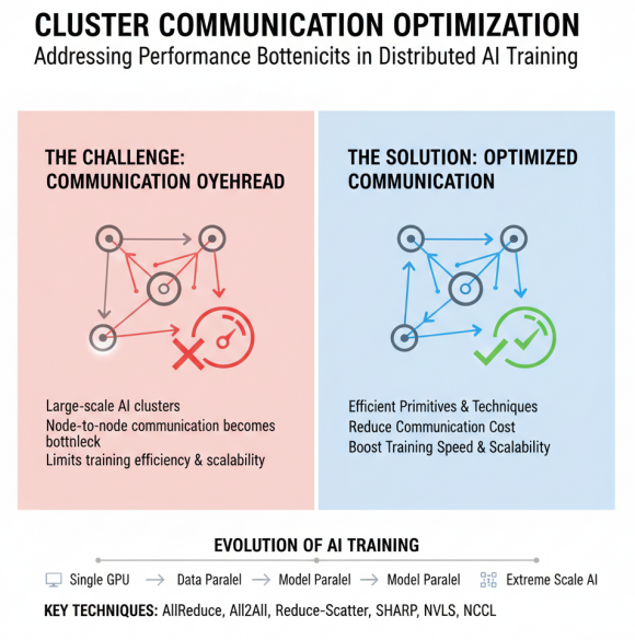 集群通信优化是大模型分布式训练的关键技术,直接影响训练效率和扩展性。在大规模AI集群中,节点间的通信开销往往成为性能瓶颈,因此需要通过高效的通信原语和优化技术来降低通信开销,提高训练效率。