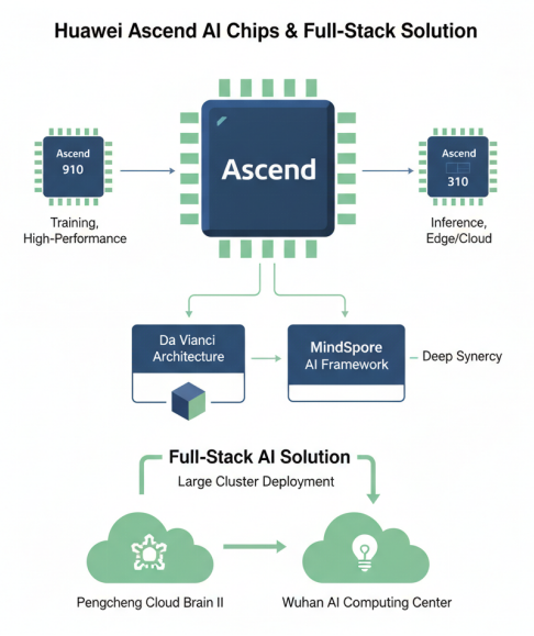华为昇腾系列芯片包括昇腾910和昇腾310等,其中昇腾910是面向训练的高性能AI芯片,昇腾310主要面向推理场景。昇腾芯片采用达芬奇架构,支持3D Cube计算引擎,在AI计算性能方面具有竞争力。华为还推出了MindSpore AI框架,与昇腾芯片深度协同,形成了全栈AI解决方案。昇腾芯片在鹏城云脑II、武汉人工智能计算中心等大集群实践中得到广泛应用。