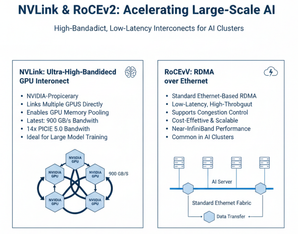 RoCEv2(RDMA over Converged Ethernet version 2)是基于以太网的RDMA(远程直接内存访问)技术,在标准以太网上实现低延迟、高吞吐的数据传输。RoCEv2支持拥塞控制和流量控制,能够在不增加专用网络设备的情况下提供接近InfiniBand的性能。在大规模AI集群中,RoCEv2因其成本优势和标准化特性,成为广泛选择的高速互联技术。