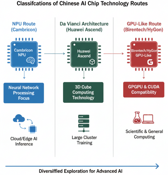 从技术路线来看,国产AI芯片主要分为三类:一是以寒武纪为代表的NPU路线,专注于神经网络处理;二是以华为昇腾为代表的达芬奇架构路线,强调3D Cube计算技术;三是以壁仞为代表的类GPU路线,兼容CUDA生态。这些不同的技术路线反映了国产AI芯片在追赶国际先进水平过程中的多元化探索。