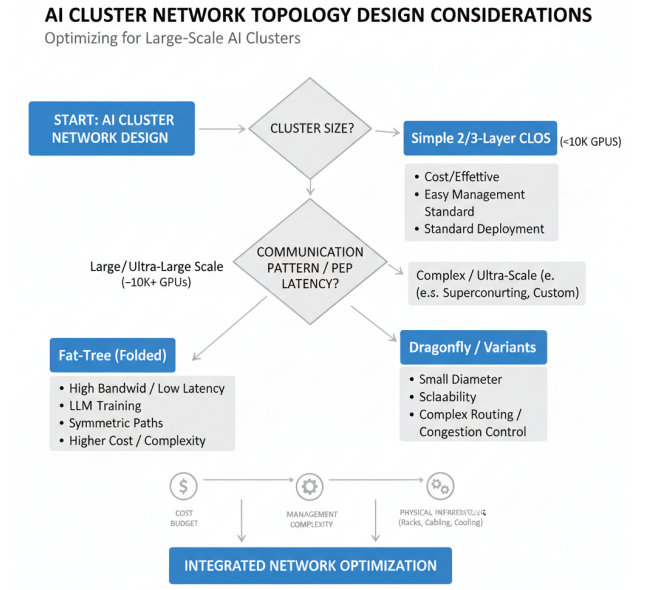 在实际部署中,智算中心网络拓扑设计需要考虑多个因素:集群规模、通信模式、成本预算、管理复杂度等。对于中小规模集群,通常采用简单的二层或三层CLOS架构;对于大规模集群,可能需要更复杂的拓扑结构,如Dragonfly或其变种。此外,网络拓扑设计还需要与机柜布局、线缆管理、散热设计等物理设施相协调,实现整体系统的最优化。