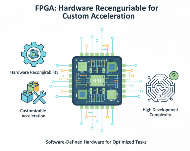 FPGA(现场可编程门阵列)具有硬件可重构的特点,用户可以根据特定应用需求定制硬件逻辑,实现高度优化的计算加速。FPGA在能效比和灵活性方面具有优势,特别适合需要定制化加速的场景。然而,FPGA开发复杂度高,需要专业的硬件设计知识,且运行频率相对较低,在大规模部署时面临挑战。与GPU/CPU相比,FPGA采用软件定义的硬件架构,硬件逻辑可根据需求动态调整,而GPU/CPU硬件固定,其并行性设计是适应固定硬件的。