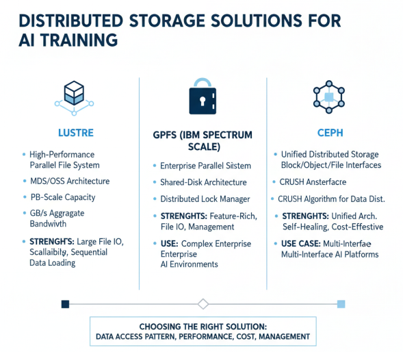 GPFS(General Parallel File System,现称IBM Spectrum Scale)是IBM开发的高性能分布式文件系统,支持多种存储架构和访问协议。GPFS采用共享磁盘架构,通过分布式锁管理机制实现数据一致性,支持高并发访问。GPFS的优势在于全面的特性支持、良好的小文件性能和强大的管理功能,适合复杂的企业级AI训练环境。