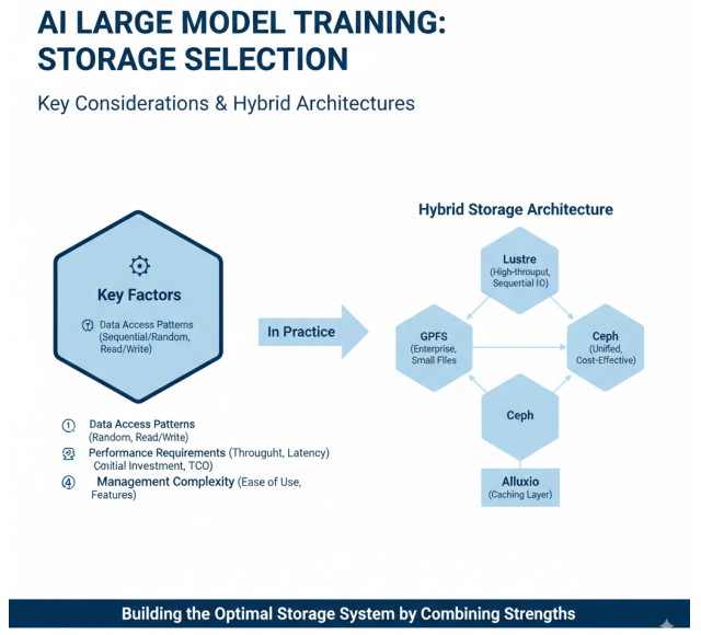 在大模型训练中,分布式存储技术的选择需要考虑多个因素:数据访问模式、性能需求、成本预算、管理复杂度等。对于大规模顺序访问为主的训练场景,Lustre是理想选择;对于需要多种存储接口的复杂环境,Ceph提供统一解决方案;对于企业级关键应用,GPFS提供全面的特性支持。在实际部署中,通常采用混合存储架构,结合不同存储技术的优势,构建最适合大模型训练的存储系统。