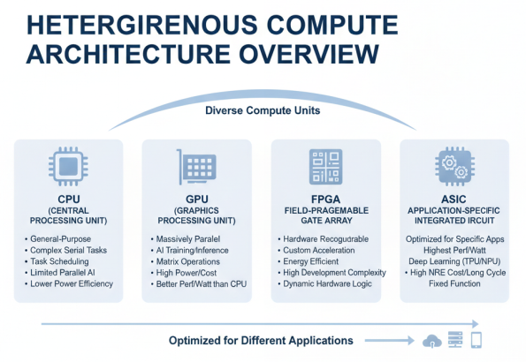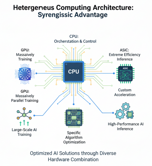 在大模型场景下,不同芯片各有所长:GPU适合大规模并行训练,ASIC适合高能效推理,FPGA适合特定算法加速,CPU适合任务调度和控制。异构计算架构通过合理组合这些不同类型的计算单元,可以充分发挥各自优势,实现整体系统性能的最优化。