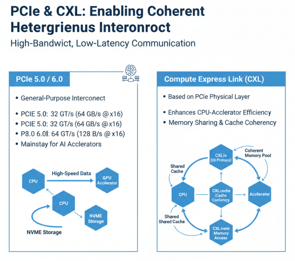 PCIe(Peripheral Component Interconnect Express)是计算机系统中广泛使用的高速互联标准,目前主流的是PCIe 5.0,正在向PCIe 6.0发展。PCIe 5.0提供32GT/s的传输速率,x16配置下可提供约64GB/s的带宽,满足大多数AI加速卡的互联需求。PCIe 6.0进一步将传输速率提升至64GT/s,并引入PAM4调制技术,在相同物理层下实现带宽翻倍。PCIe 5.0/6.0已成为AI加速器与主机系统互联的主流选择,为AI计算提供高带宽、低延迟的数据传输通道。