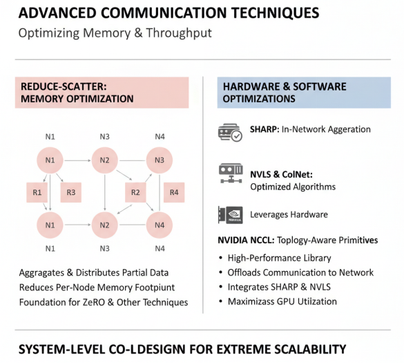 为了进一步提高通信效率,业界提出了多种优化技术。SHARP(Scalable Hierarchical Aggregation and Reduction Protocol)技术通过在网络设备中执行聚合操作,减少数据在节点间的传输量,显著提高分布式深度学习工作负载的可扩展性和性能。NVLS与CollNet是专为优化AllReduce性能设计的特殊算法,其中NVLS还通过利用特定硬件能力支持ReduceScatter和AllGather操作。