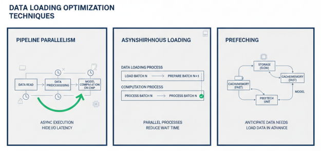 数据加载是将预处理后的数据高效传输到计算设备(如GPU)内存中的过程。在大模型训练中,数据加载往往成为性能瓶颈,特别是在分布式训练场景中,多个计算节点同时加载数据,对存储系统和网络带宽提出极高要求。为了优化数据加载效率,通常采用以下技术: