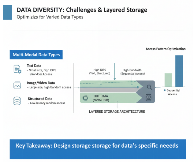 大模型存储需求还体现在数据多样性上。训练数据通常包括文本、图像、音频、视频等多种模态,每种数据类型对存储系统的要求各不相同。文本数据通常体积小但数量多,需要高IOPS;图像和视频数据体积大,需要高带宽;结构化数据则需要低延迟的随机访问能力。