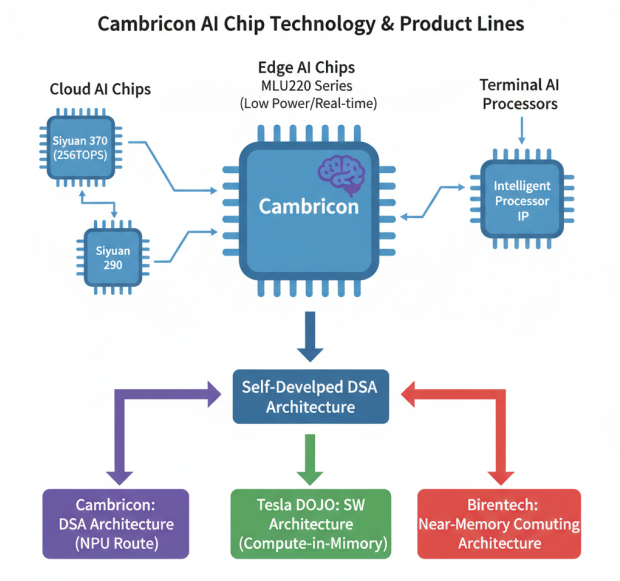 寒武纪作为国内AI芯片的领军企业,专注于人工智能芯片产品的研发与技术创新,提供云边端全场景AI芯片产品。云端产品线包括思元290、思元370等,其中思元370达到256TOPS INT8算力;边缘端产品线包括MLU220系列,提供低功耗、高实时性的AI加速能力;终端产品线包括智能处理器IP,授权给终端设备厂商使用。寒武纪采用自研DSA计算架构,与特斯拉DOJO的存算一体架构和壁仞科技的近存架构形成不同的技术路线。