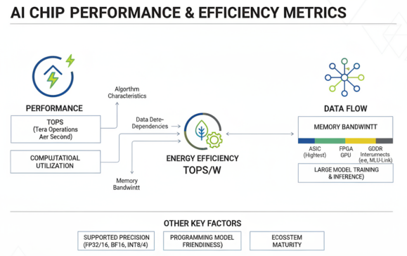 AI芯片的性能和能效评测涉及多个关键指标,包括TOPS/W(每瓦特万亿次运算)、算力利用率、内存带宽等,这些指标综合反映了芯片在实际应用中的表现。