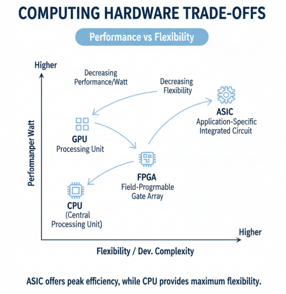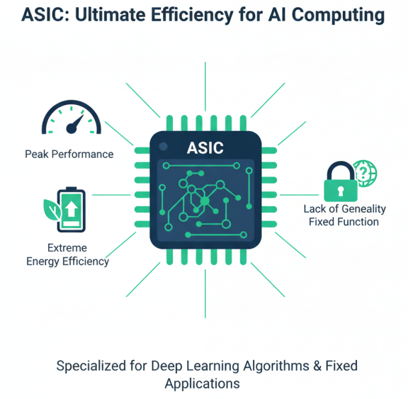 ASIC(专用集成电路)针对特定应用进行优化,在能效比和性能方面表现最佳。AI领域的ASIC如TPU、NPU等,针对深度学习算法特点进行专门优化,实现了极高的计算密度和能效比。然而,ASIC缺乏通用性,开发成本高,周期长,适合大规模、固定场景的应用。从能耗比方面来看,ASIC > FPGA > GPU > CPU,产生这样结果的根本原因是:对于计算密集型算法,数据的搬移和运算效率越高的能耗比就越高。