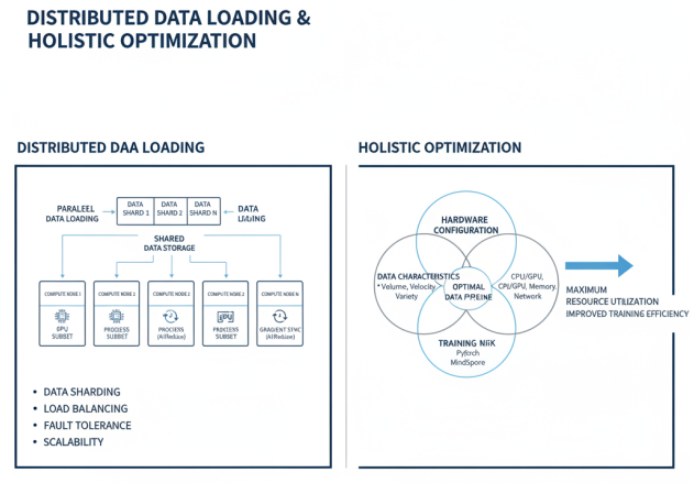 分布式数据加载是大规模分布式训练中的关键技术,通过将数据分片存储在多个节点上,实现数据加载的并行化。在数据并行训练中,每个节点负责加载和处理数据的一个子集,通过AllReduce等通信原语实现梯度同步。分布式数据加载需要解决数据分片、负载均衡、容错等问题,确保每个节点都能高效获取所需数据。