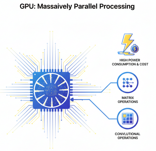 GPU(图形处理器)最初为图形渲染设计,因其强大的并行计算能力而成为AI训练和推理的主流选择。GPU拥有数千个计算核心,适合执行大规模并行计算任务,特别是在矩阵运算、卷积运算等AI核心算法上表现优异。然而,GPU功耗较高,成本昂贵,且在某些特定算法上效率不如专用芯片。在能效比方面,GPU优于CPU但不及FPGA和ASIC。