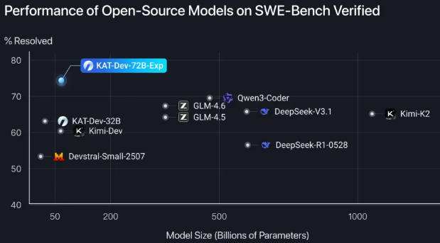 KAT-Dev-72B-Exp是一个专门为软件工程师定制的,在SWE-Bench Verified的硬核编程能力测试里,拿到了74.6%的准确率。这个分数,直接登顶了所有开源代码模型的第一名,并且跟闭源GPT-5的74.9%成绩,就差了那么一丁点儿。