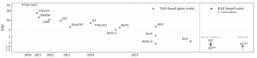 这篇关于RAE的论文,正是他研究脉络的延续。它将最先进的表征学习成果(MAE、DINO等)和最强大的生成模型框架(DiT)完美地结合在一起,解决了困扰后者许久的问题。
