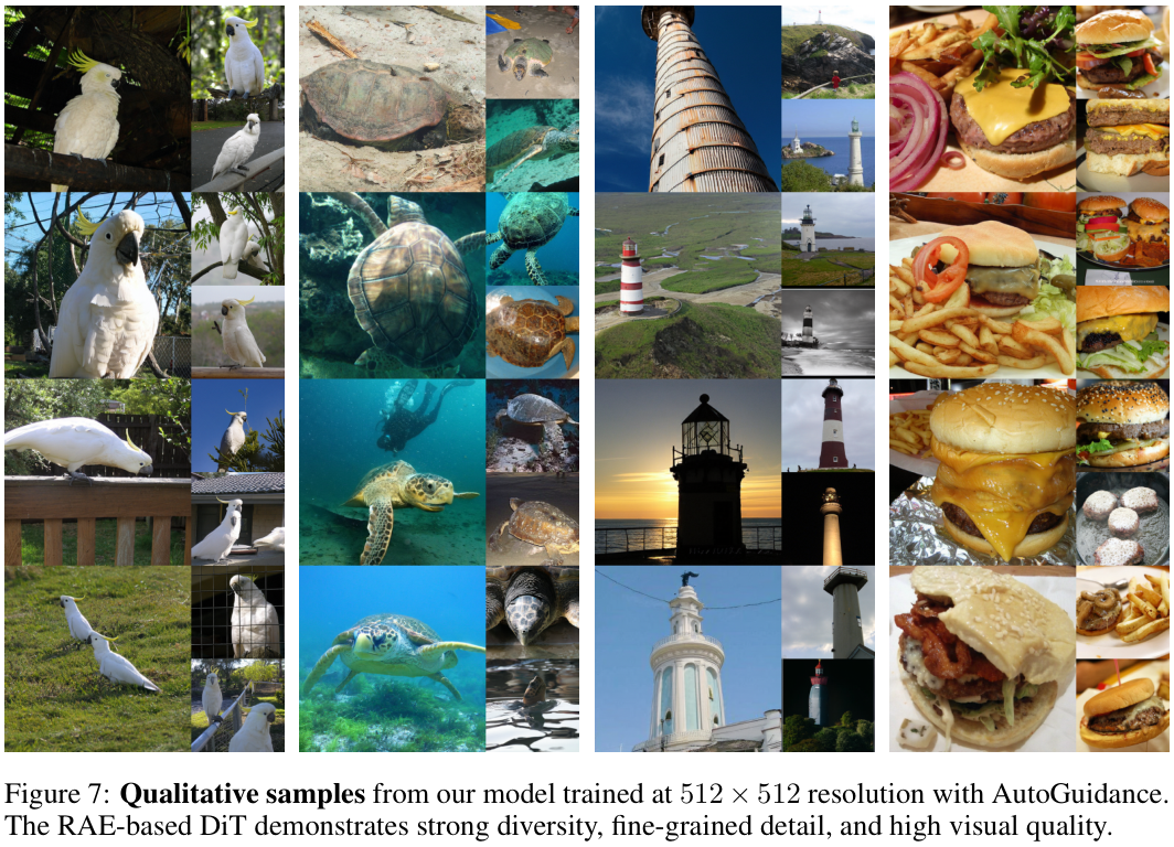 使用AutoGuidance在512×512分辨率下训练的模型所生成的定性图像,展现出强大的多样性、精细的细节和较高的视觉质量。