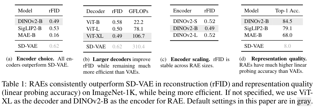 在ImageNet-1K数据集上,RAE在重建(rFID)和表征质量方面始终优于SD-VAE,同时效率更高。