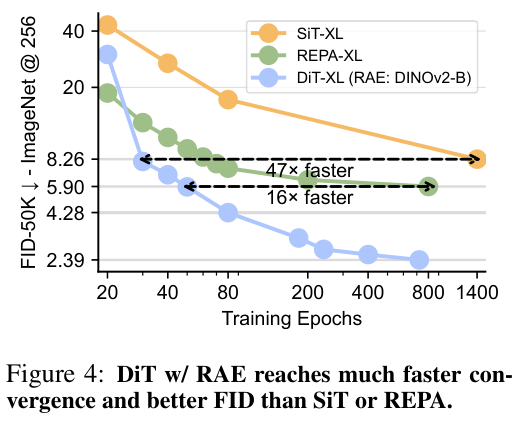 除了最终效果好,收敛速度也快得惊人。在同等模型大小下,基于RAE的DiT不仅比基于VAE的基线(如SiT-XL)训练速度快了47倍,甚至比最近的一些基于表征对齐的方法(如REPA-XL)也快了16倍。
