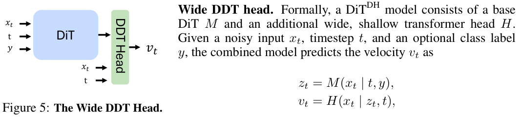 于是,研究人员借鉴了一篇名为DDT(Decoupled diffusion transformer)的论文。核心思想是,没必要把整个模型都搞得那么宽。DiT的主干部分可以保持原来的宽度,负责处理序列信息。而在最后负责去噪的那一步,给它加上一个又宽又浅的Transformer模块,专门用来处理高维度的去噪任务。