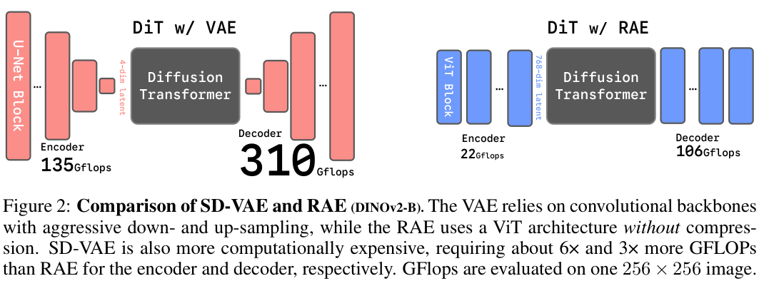 SD-VAE与RAE(DINOv2-B)比较。VAE依赖于具有强烈下采样和上采样的卷积骨干网络,而RAE则使用无压缩的视觉Transformer(ViT)架构。SD-VAE的计算成本也更高,其编码器和解码器所需的GFLOPs分别约为RAE的6倍和3倍。