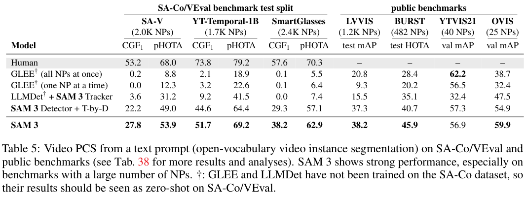 在视频PCS任务上,SAM 3同样大幅领先基线模型,证明了其在复杂动态场景下的强大分割与跟踪能力。