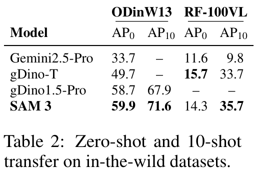 在少样本适应性测试中,SAM 3也展示了强大的学习能力。只需10个样本进行微调,它在ODinW13和Roboflow100-VL这两个数据集上的表现就超过了Gemini和专业的检测模型gDino。