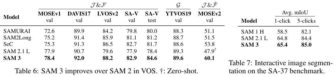 即使是在传统的PVS任务上,SAM 3也比它的前辈SAM 2更强,无论是在视频对象分割还是交互式图像分割上,都取得了更好的成绩。