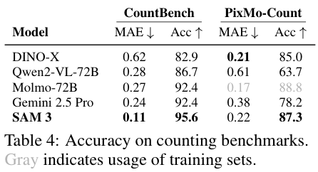 有趣的是,SAM 3还能用来数数。在对象计数基准上,它的准确率和平均绝对误差都优于Qwen2-VL-72B、Gemini 2.5 Pro等一众强大的多模态大语言模型(MLLM)。而且,它在数数的同时,还能把每个对象都给你分割出来,这是绝大多数MLLM做不到的。