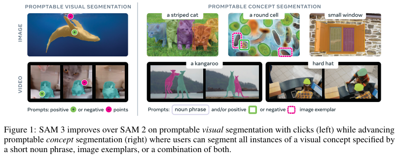 就是你给它一张图或者一段不超过30秒的短视频,然后用一句话、一张示例图,或者两者结合的方式告诉它你要找什么“概念”,它就得把这个概念下的所有实例都检测、分割、并跟踪出来。