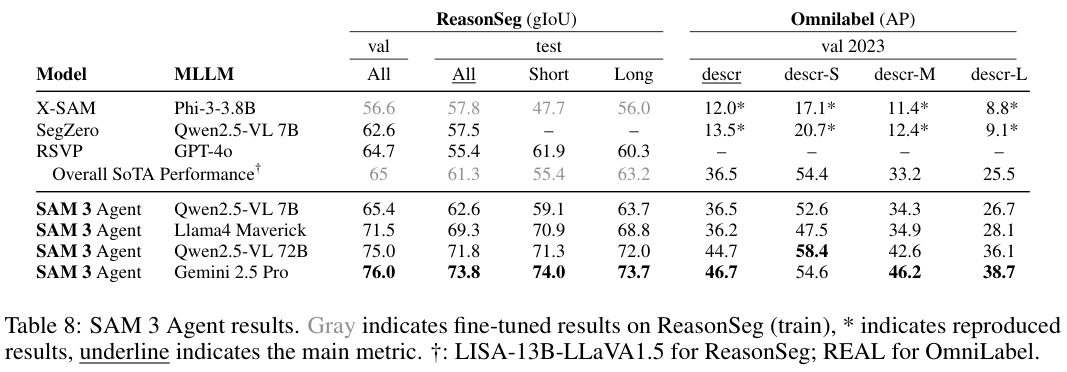 结果惊人。在ReasonSeg和OmniLabel这两个专门测试推理分割的基准上,零样本的SAM 3 Agent全面超越了之前所有经过专门训练的模型。这证明了SAM 3作为一个基础视觉工具的强大和通用性。它可以和各种MLLM即插即用,赋予它们强大的视觉感知和操作能力。
