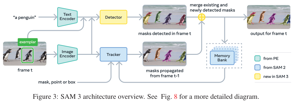 对于视频,SAM 3用检测器加跟踪器的组合拳来处理。每一帧画面来了,检测器先找出新出现的目标,同时,跟踪器会把上一帧已经跟踪到的目标传播到当前帧。然后通过一个匹配函数,把新检测到的和跟踪过来的目标合并、更新,实现连贯的跟踪。