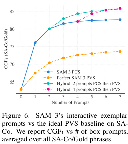 在模拟人类交互的实验中,SAM 3的PCS能力比传统的PVS(点一下改一个)效率高得多。因为它能从你给的示例中泛化,比如你告诉它一个漏掉的目标,它会主动去寻找其他类似的目标。仅仅3次点击交互,PCS的CGF1分数就比纯文本提示高了18.6个点。