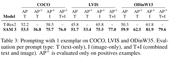 当使用图像示例进行提示时,SAM 3同样表现出色,在COCO、LVIS等数据集上显著优于之前的SOTA模型T-Rex2。