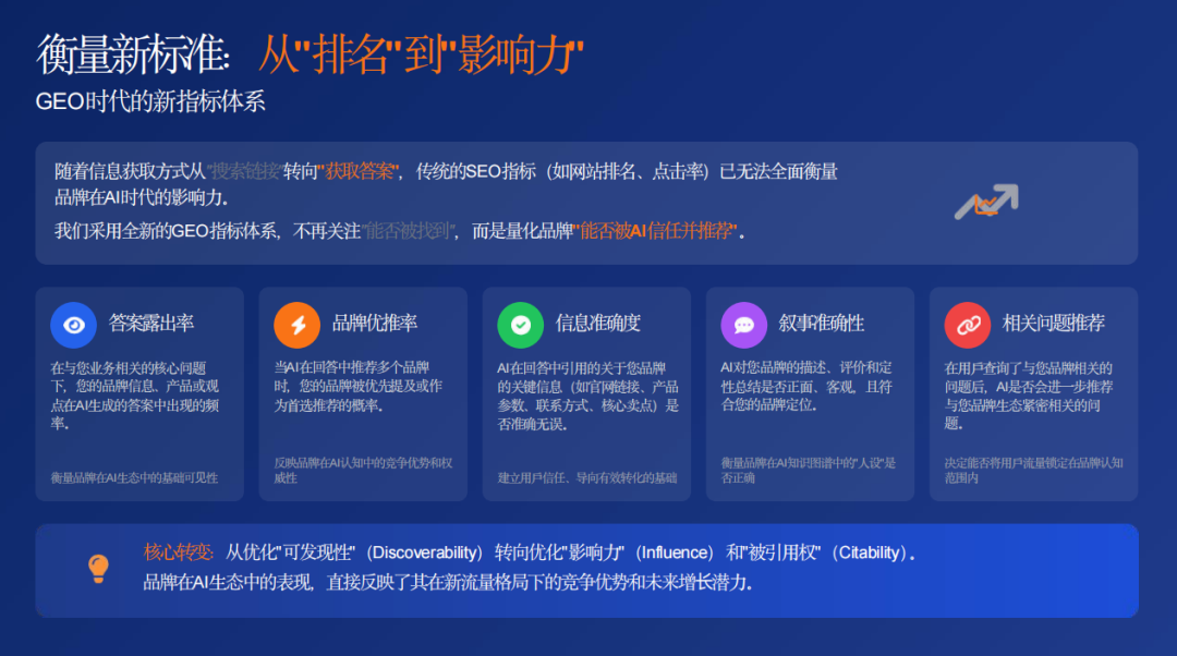 与传统SEO关注排名不同,GEO有一套独特的指标体系: