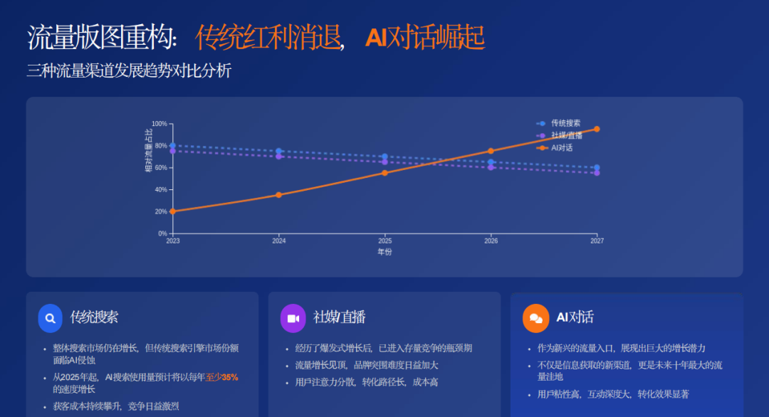 与传统搜索和社媒流量下降形成鲜明对比的是,AI对话的用户量正在持续增长。这为企业提供了新的机遇——"有鱼的地方钓鱼",在用户聚集的地方进行客户教育、转化和交易。