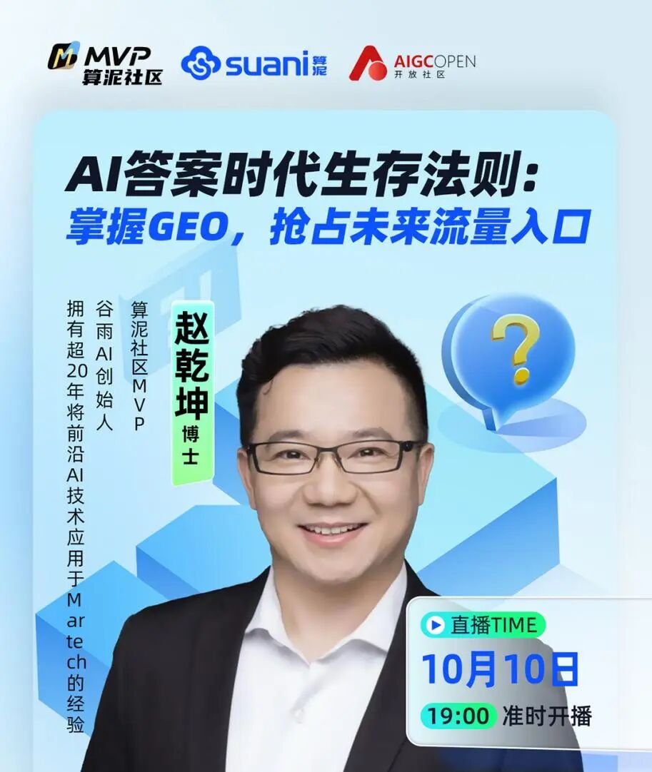 在10月10日算泥社区MVP分享栏目中,拥有超20年前沿AI技术应用于Martech实战经验的谷雨AI创始人赵乾坤博士,聚焦「AI 答案时代生存法则:掌握 GEO,抢占未来流量入口」主题,深刻指出这一变革的核心在于用户心智的迁移——从主动搜索转向依赖AI生成答案。 从底层逻辑到实操落地,带大家了解了GEO(生成式引擎优化)这一未来流量入口的关键策略。