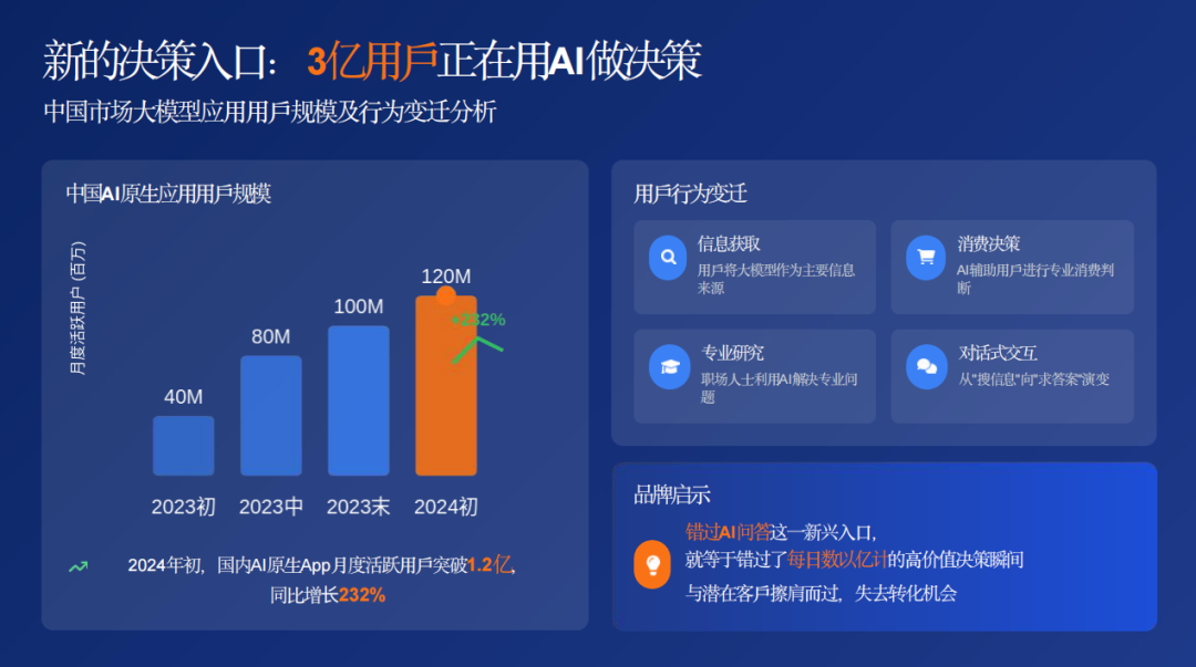 当前,中国直接使用六大模型厂商产品的用户已远超3亿,全球范围内OpenAI的周活跃用户约达8亿。这些用户通过AI解决生活中的各类需求,从信息查询、商业决策到工作辅助和个人生活问题。AI正逐渐成为用户获取信息、做出决策的首选渠道,这一趋势为企业带来了全新的机遇与挑战,也印证了赵乾坤博士对AI答案时代流量格局变迁的精准判断。