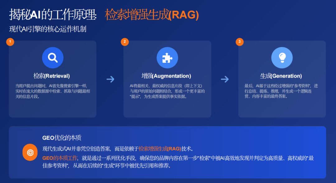 GEO的优化机会主要在于第三步,即如何让自身内容更容易被大模型检索、理解和引用。