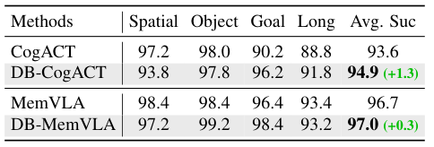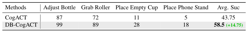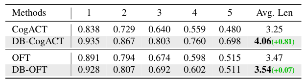 在针对长视野任务的CALVIN基准上,DB-CogACT在所有指标上都优于官方CogACT,平均任务完成长度从3.25提升到了4.06。