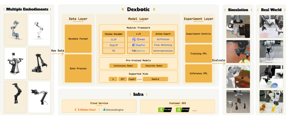 从软件到硬件,从代码到部署,Dexbotic试图覆盖从仿真验证到真实机器人无缝落地的完整流程,打通研发测试的最后一公里。