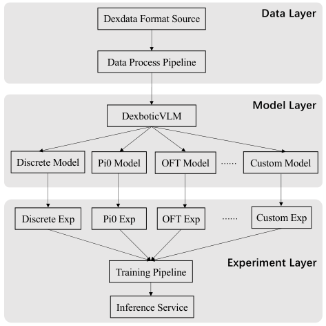 第三层是实验层。这是Dexbotic的精髓所在。它基于模型层的实现,创造了一套实验脚本机制。用户想跑一个新实验,不再需要重写大量代码,往往只需要修改几行配置,就能快速启动。这种分层配置+工厂注册+入口分发的软件架构,在保证系统稳定性的前提下,赋予了框架极高的灵活性。